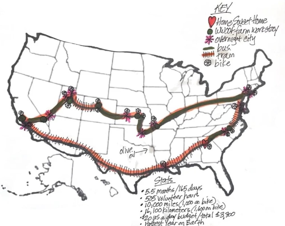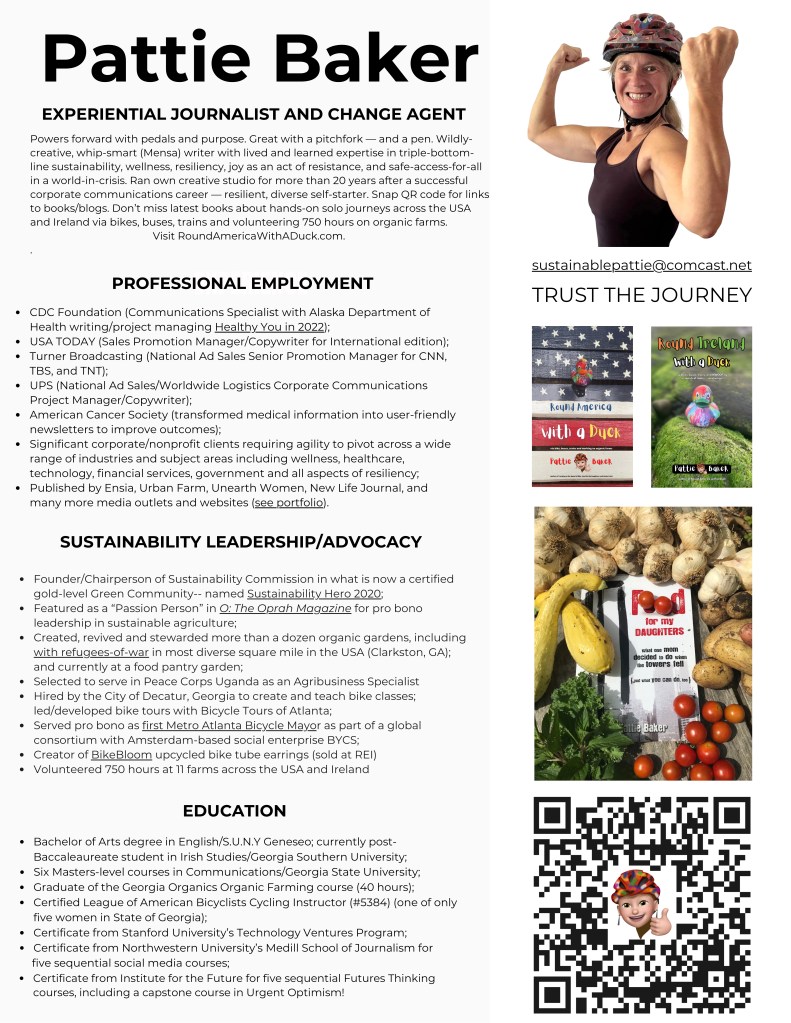 A 1960s-child (now a married mother-of-two) about to turn 60 travels 10,000 miles/16,100 kilometers via bike, buses, trains and WWOOFing, working more than 500 hours on organic farms in exchange for food and shelter. And then she does it again — 40 days, 150 volunteer farms hours, at age 61 — across the land of her ancestors during the 100th-anniversary-year of when they left there for US soil. Join her — and her joyful, conversation-starting duck — in search of hope (and home) in two countries-at-crossroads and a world-in-crisis. You’ll laugh. You’ll cry. You’ll sing along to cows. You may even get inspired to try something new on your own life journey!