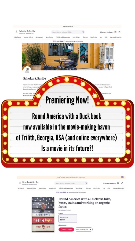 For those of you who like to support local and indie businesses, I have great news for you! Round America with a Duck is now available in the movie-making haven of Trilith, Georgia. It’s at the newest bookstore in the USA, Scholar and Scribe (for the exact same price as on Amazon). You can order your print copy here.