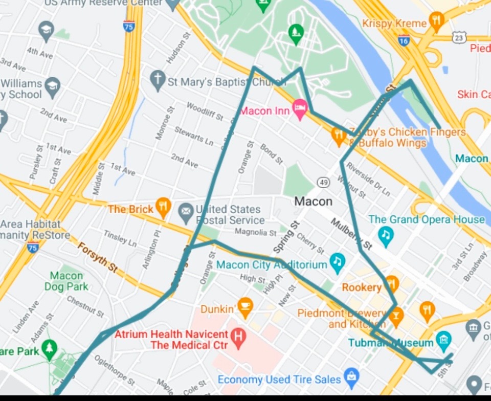 I tossed my folding bike in the cargo bay of a Greyhound bus and spent the day just two hours away in Macon, Georgia. I was pilot-testing the bus, bike, and rain gear (it poured all day) for Round America with a Duck two months before I left on that journey. Pictured is my route that day. As you can see, I simply wandered. Nine miles worth.